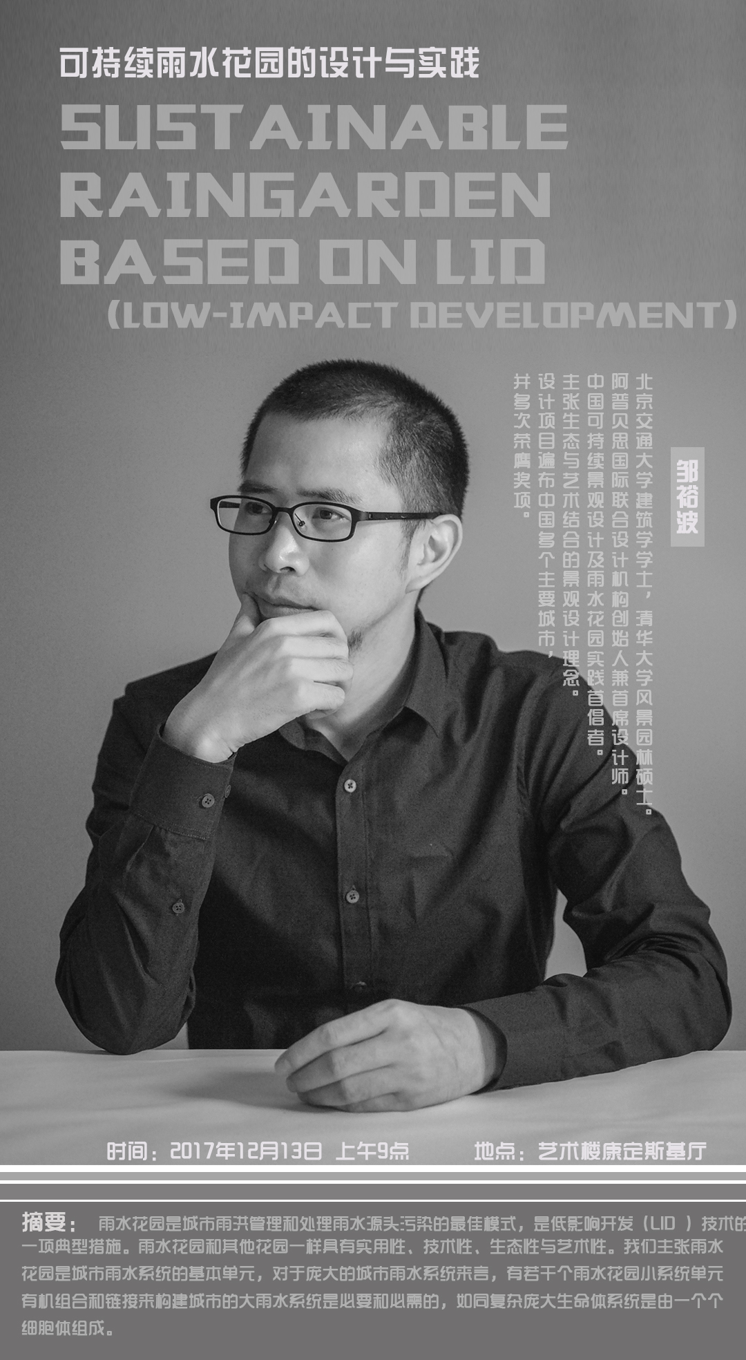2017年12月13日上午9点,中国可持续景观设计及雨水花园实践首倡者,阿普贝思国际联合设计机构创始人兼首席设计师邹裕波先生莅临288-563.com康定斯基厅,为我院14、15、16级景观专业学生举办了一场主题为《可持续雨水花园的设计实践》的专业讲座。